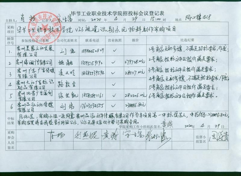 畢節(jié)工業(yè)職業(yè)技術學院VIS視覺識別系統(tǒng)物料制作采購項目第二中標候選人順延為第一中標候選人的公告