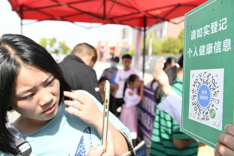 (新生在校門口掃描健康碼,憑綠碼進入學校)