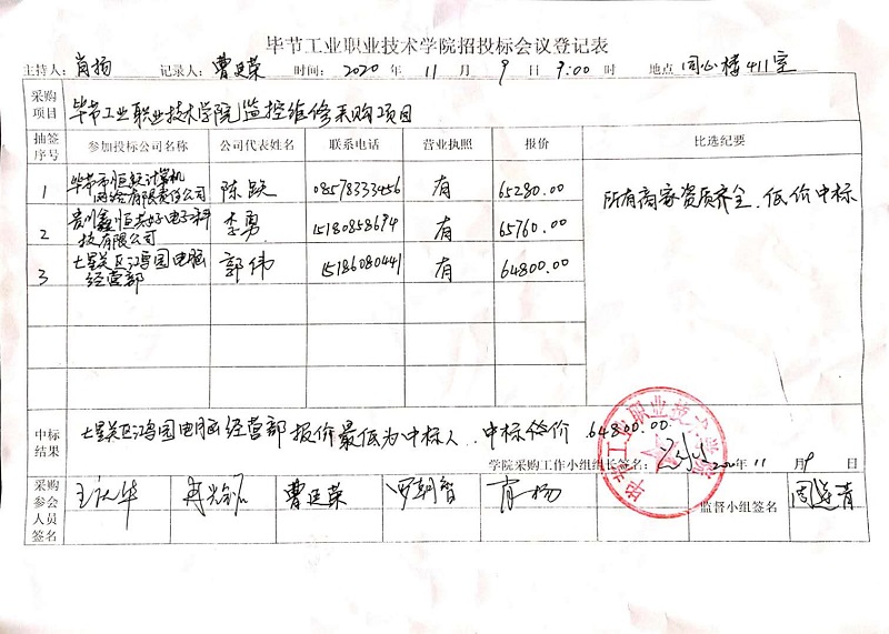 畢節(jié)工業(yè)職業(yè)技術(shù)學院監(jiān)控維修采購項目中標公告