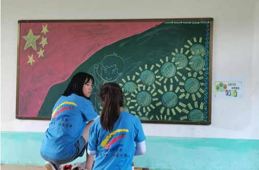 ▲志愿者將黨史知識(shí)繪到墻上和教室里