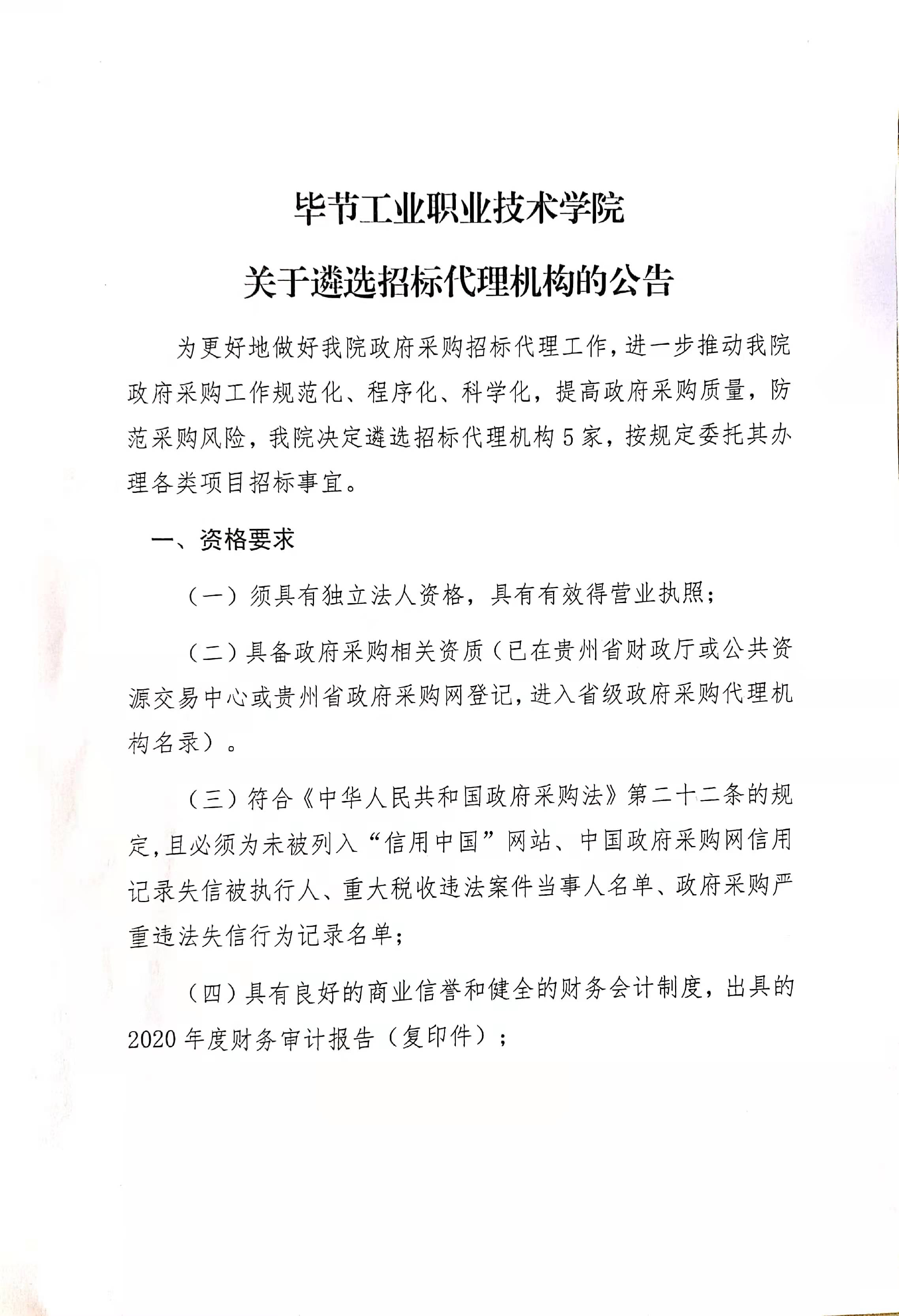 畢節(jié)工業(yè)職業(yè)技術(shù)學(xué)院關(guān)于遴選招標(biāo)代理機(jī)構(gòu)的公告