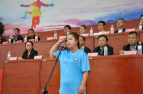 緊接著,運(yùn)動(dòng)員代表與裁判代表上臺(tái)宣誓,表達(dá)了他們對(duì)體育精神的嚴(yán)肅態(tài)度,并表示將在接下來的比賽中遵守比賽規(guī)則,力求賽出水平、賽出風(fēng)格、賽出成績。