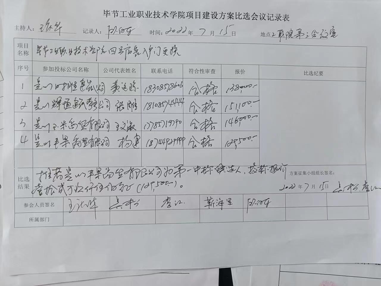 畢節(jié)工業(yè)職業(yè)技術學院四號宿舍入戶門更換比選結果公示