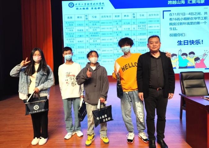 10月29日至11月1日,畢節(jié)工業(yè)職業(yè)技術學院迎來了近3000名“小可愛”。在11月2日-3日開展的“開學第一課“上,學院黨委副書記、院長邱國援為過生日的16位同學送上了一份精心準備的禮物,通過別樣的祝福引導新同學扣好人生的“第一??圩印保屗麄冊诔錆M驚喜和愉悅的氣氛下度過了進入畢節(jié)工職院的第一個特別的生日。
