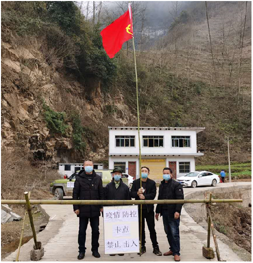 (圖2:畢節(jié)工職院派駐青山村第一書記趙澤龍帶領村干部在青山村卡點開展防控值守)