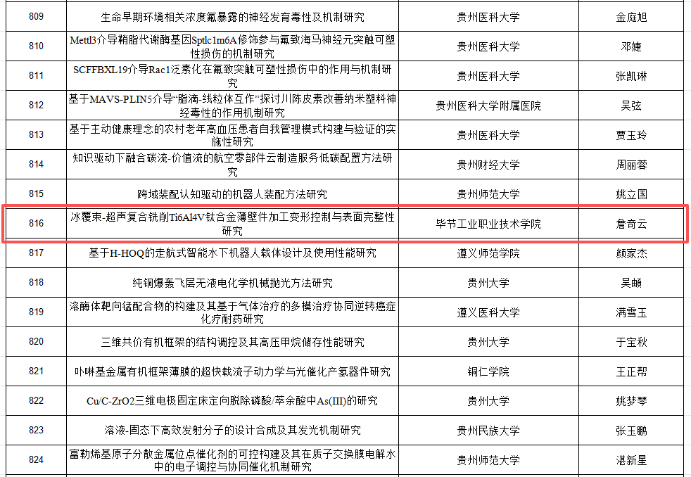 近日,貴州省科學(xué)技術(shù)廳公布了《2026年貴州省基礎(chǔ)研究計劃面上、重點項目擬立項項目公示》。我系詹奇云老師主持申報的項目《冰覆束—超聲復(fù)合銑削 Ti6Al4V 鈦合金薄壁件加工變形控制與表面完整性研究》成功入選,擬獲2026年貴州省基礎(chǔ)研究計劃面上項目立項,充分彰顯了我院在基礎(chǔ)研究領(lǐng)域持續(xù)提升的科研實力與良好發(fā)展態(tài)勢。